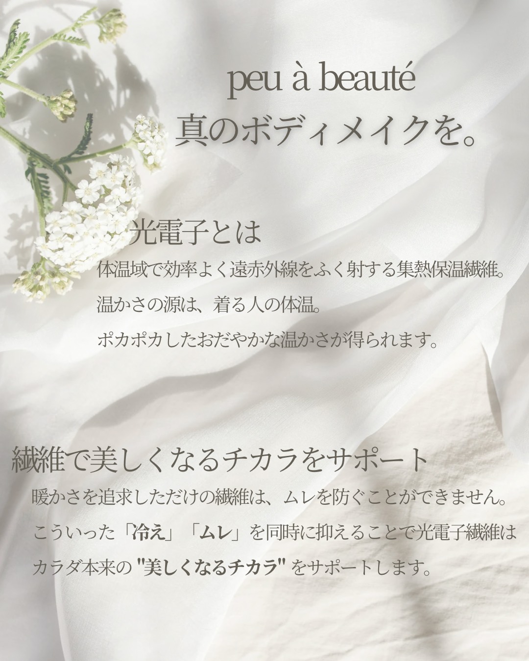 真のボディメイクを目指す女性に向けて誕生した、国産の高機能シェイプアップインナーブランドです。ブランド名に込められた「peu à peu(だんだんと)」「beauté(美しく)」という想いの通り、理想のボディラインへ向かう毎日をサポートします。
