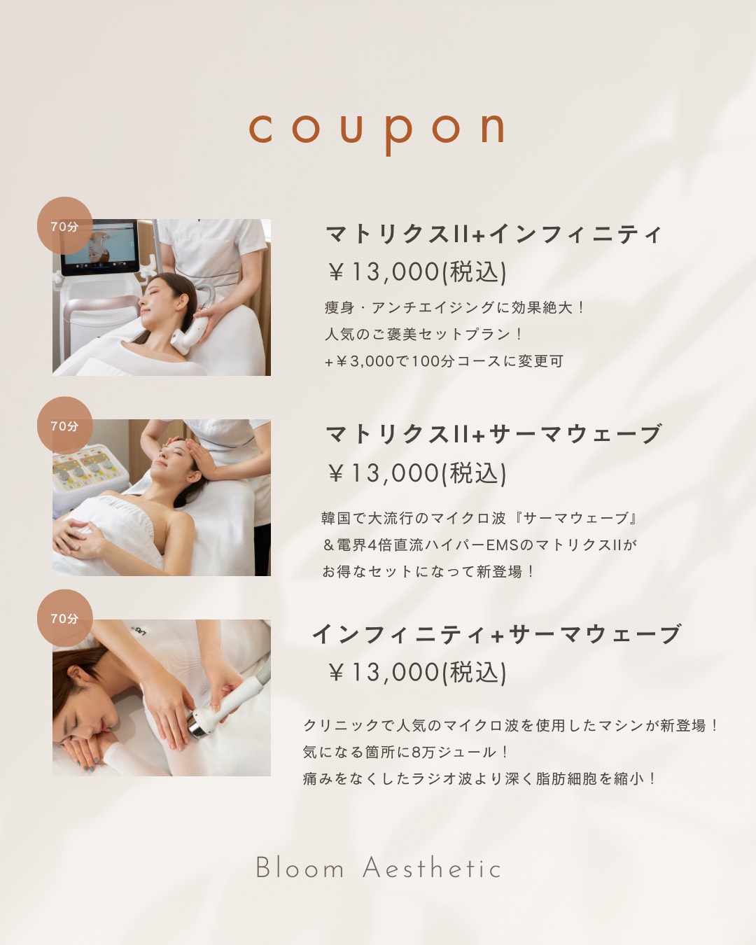 • 初回体験のお申込は、全店共通で初めてBloom のエステティックをご利用の方限定とさせていただきます。